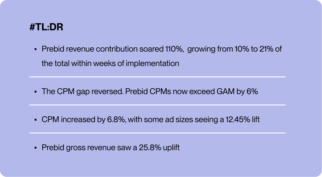 Since implementing the AI-powered dynamic flooring module in the fourth quarter of 2023, the publisher experienced a 110% increase in Prebid revenue contribution. Within a short timeframe (4-6 weeks), Prebid's share grew from 10% to 21% of total revenue.