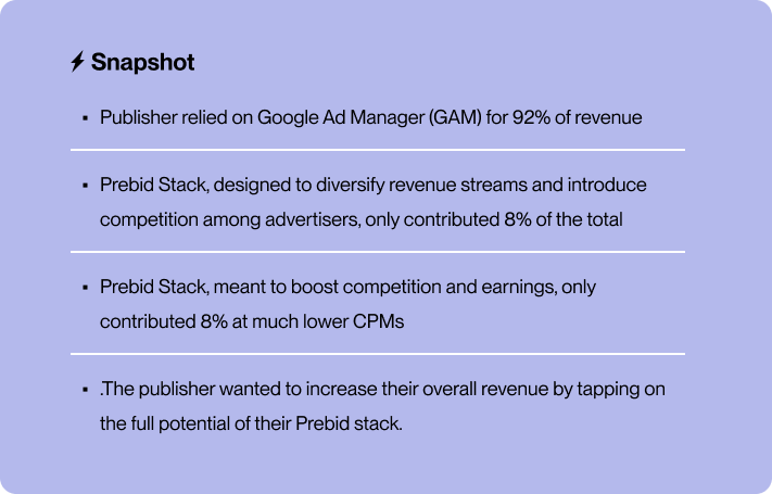The group was navigating a significant challenge within its programmatic advertising ecosystem. It relied predominantly on Google Ad Manager (GAM) for 92% of its revenue. In contrast, its Prebid Stack, a solution offering the potential for increased competition and higher earnings, was significantly underperforming.