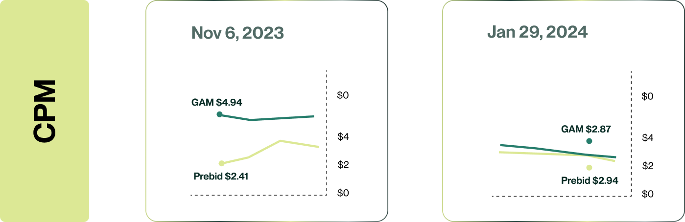 The gap in CPM performance between Prebid and GAM was not only bridged but reversed, with Prebid CPMs exceeding GAM by 6%, a stark contrast to being 60% lower in the preceding quarter.